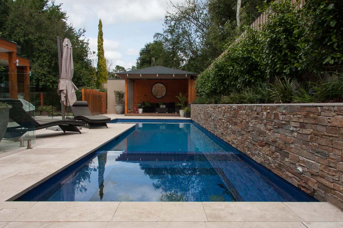 This project was recently completed by Executive Landscapes. This project included the stone cladding to the pool wall, traventine paving, exposed aggregate driveway and paths, timber pallisades, plant selection and planting.